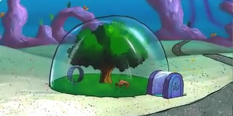 Spongebob squarepants lives in a pineapple under the sea, and his house is actually much bigger the house is just a pineapple on the outside, as it's a pretty normal house on the inside (normal on the first floor, there's the living room, coat closet, trophy closet, kitchen, laundry room, and a kitchen.